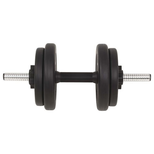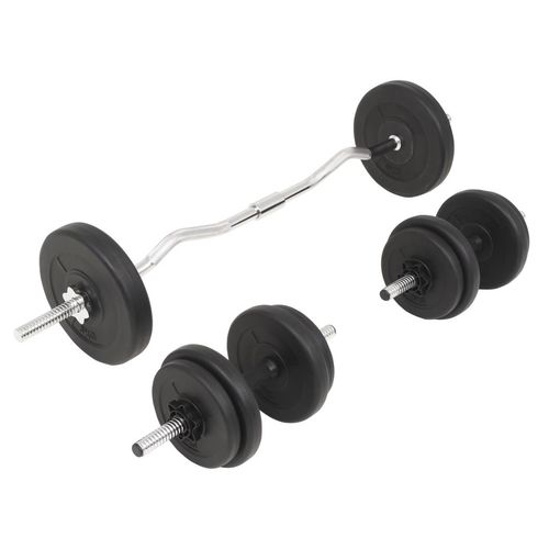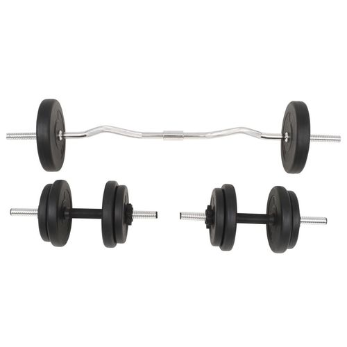This set of ergonomically designed barbell/dumbbell set will allow you to perform a large range of exercises more easily and safely at home or in the gym. The set includes 1 barbell, 2 dumbbells, and 16 weight discs. The barbell/dumbbell set features solid chrome-plated bars with quick-action spring collars (barbell bar), non-slip grips, and fluted star-screw caps (dumb bell bar) for secure attachment of the weight discs. You can work out without worrying about safety issues. The weight discs are made with a robust PE casing. They can be combined in various ways for different training purposes. Delivery includes 1x barbell bar, 2x dumbbell bars, 6x 1.25 kg weight discs, 4x 2.5 kg weight discs, 4x 5 kg weight discs, 2x 10 kg weight discs, and 6x caps.