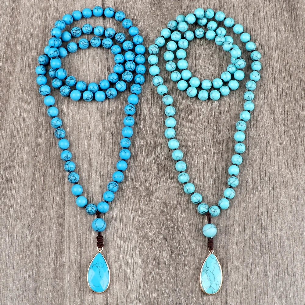 Bohemian Blue Pine Stone Beaded Necklace Handmade Knotted Charm Matching Drop Pendant Necklaces Bangles Women Men Jewelry Gifts